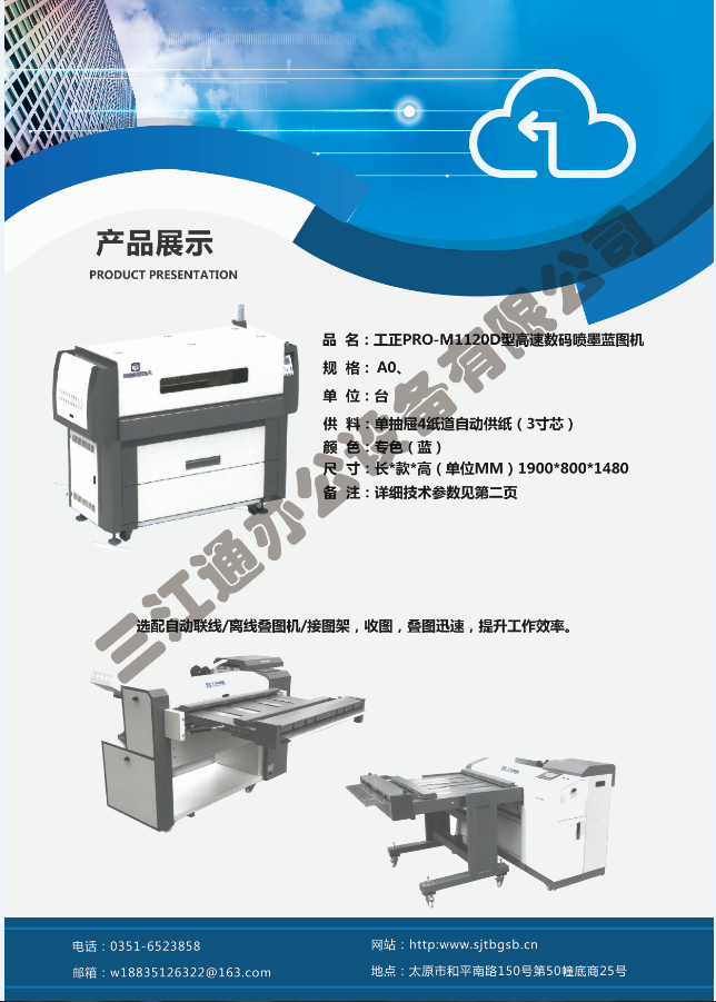 太原市三江通辦公設備有限公司是一家專業從事曬圖機、數碼復印機、多功能打印、復印、掃描、縮放一體機、模擬工程復印機、繪圖儀、大型掃描儀、電子歸檔設備、手動、自動成形圖紙檔案密集柜、圖前圖后設備以及所有制圖設備耗材供應、維修一條龍的實體企業。多年來,已與日本、北京、天津、上海、杭州等諸多家廠方多方合作,成為山西>>更多